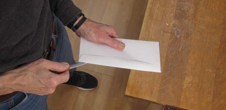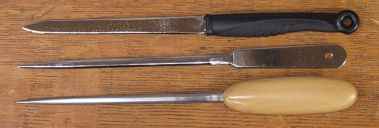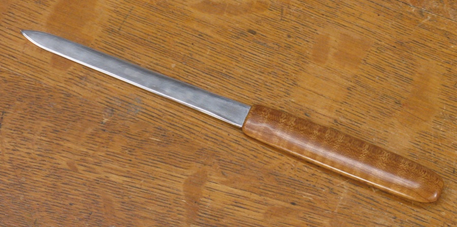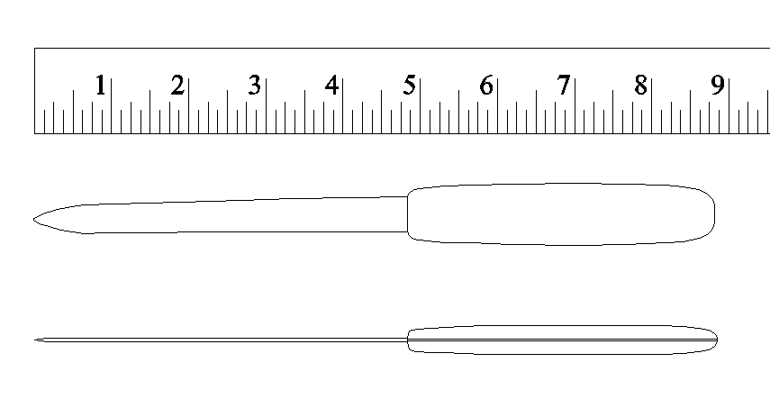 For a woodworking project, this is about as simple as it gets but it still resulted in a nice-looking and practical device (that admittedly may get used only a few times a year). The original opener fit in the hand well but wasn't suited to a pen cup where everything else was substantially shorter and lighter. This new one uses a wider and shorter blade and a less-voluminous handle, the combination of which helped substantially with the balance. The opener was simple enough that I didn't even bother to work from a plan but just for completeness I made one after the fact.