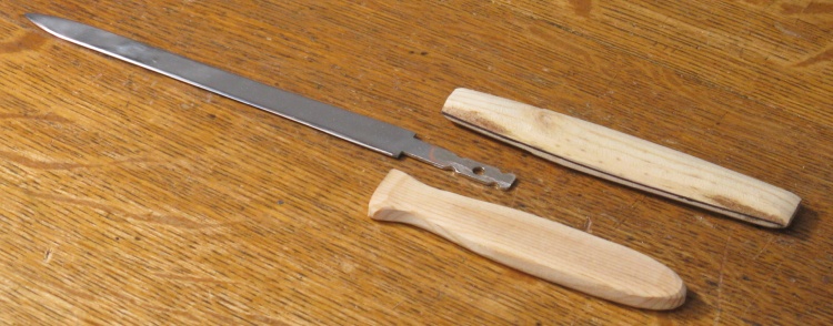 The slot was formed by making a groove on each handle side with a bit of small-chisel work, starting with the veneer-equipped side.