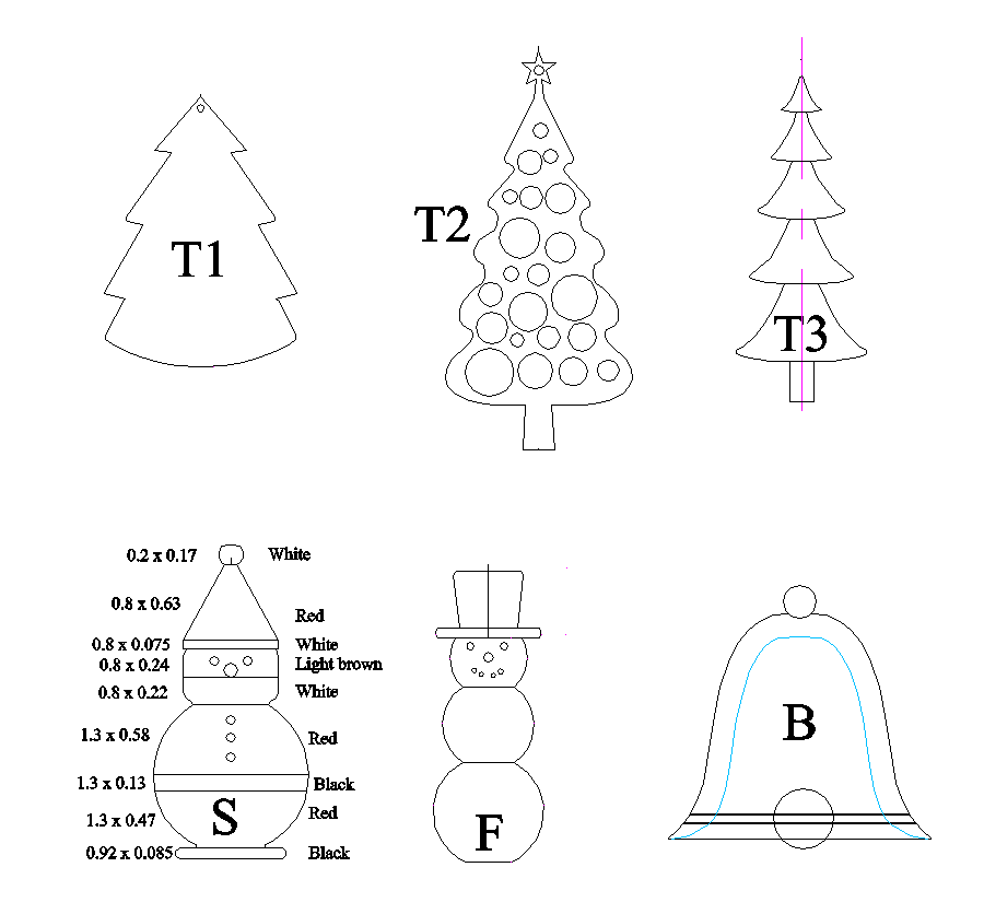 I started on this project by searching for images of wooden Christmas tree ornaments and gathering a group of those that I liked. That group was further whittled down (Ha!) and then drawn up and appropriately scaled, giving me the group shown below. They are all turned pieces except T1 and T2 which are essentially flat. Then I printed out the plans and dove in.