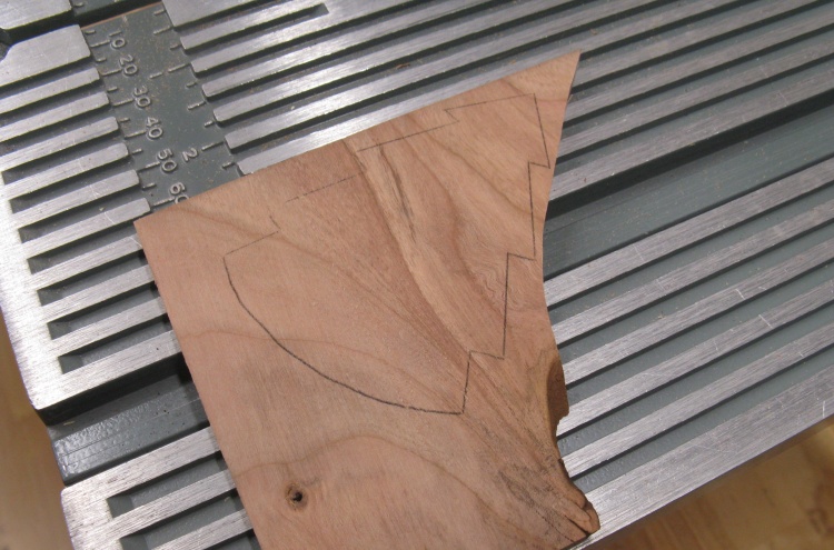 The block was sliced into about 0.2"-thick layers and here a tree shape has been traced on to one of them using my usual carbon-paper technique.