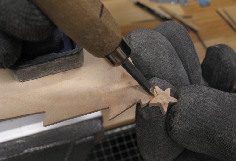 I also made some trees from a small block of Box Elder burl and there was a bit more room so I added a star to the top. That needed a bit of carving to define it as can be seen here.