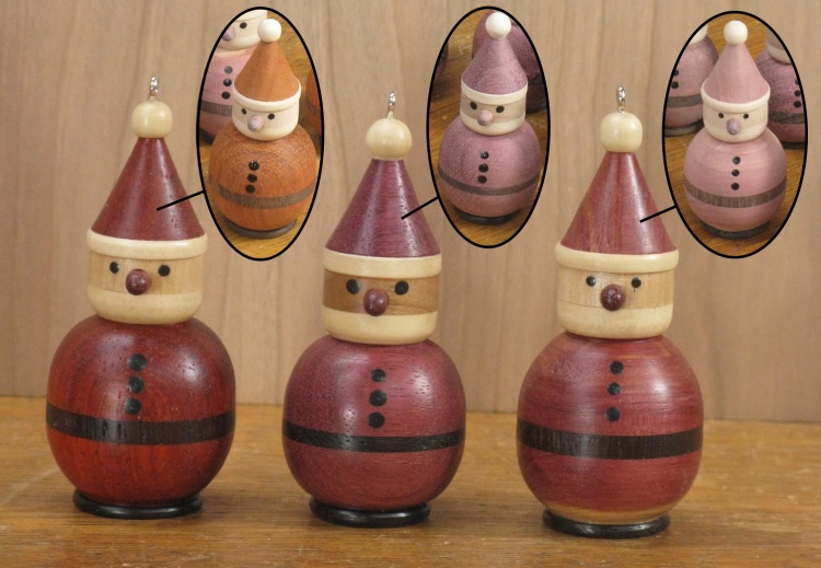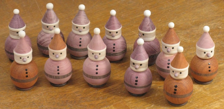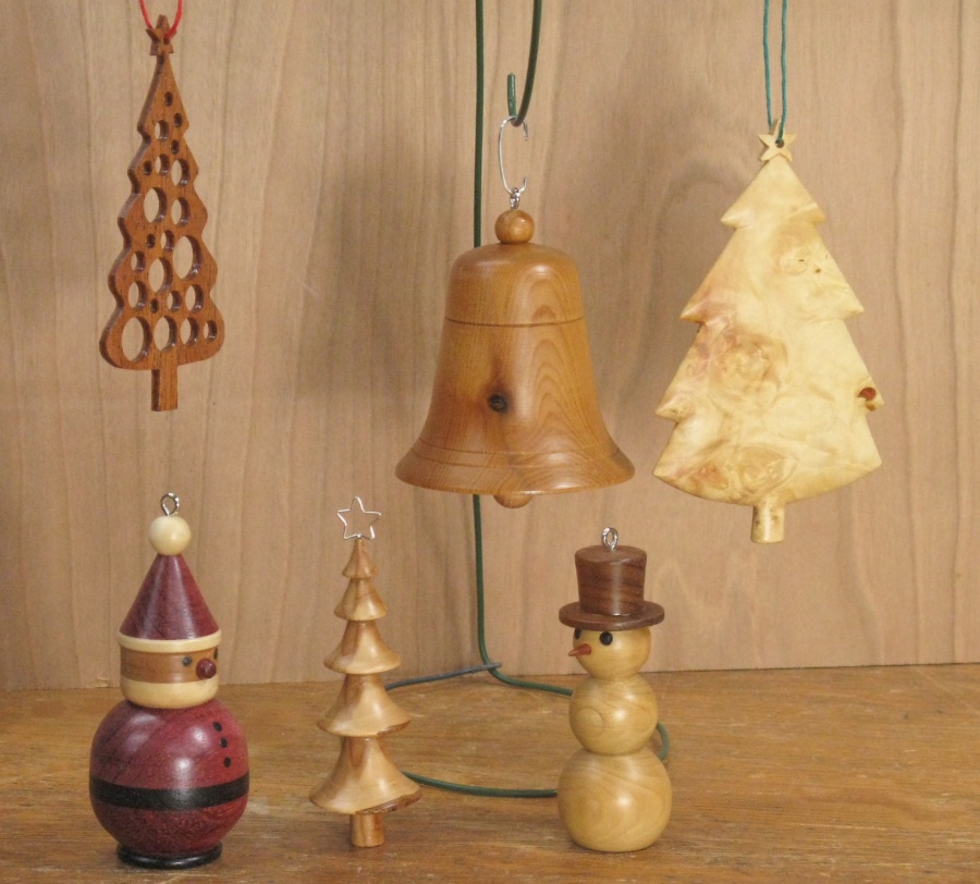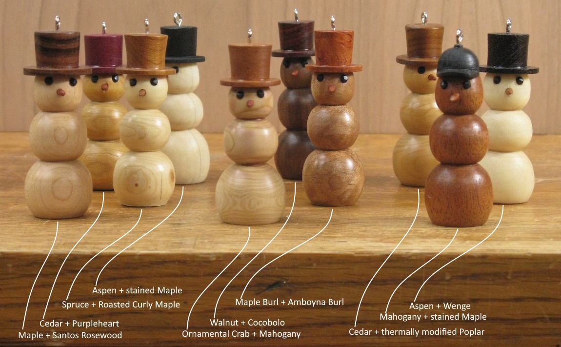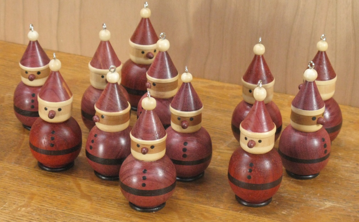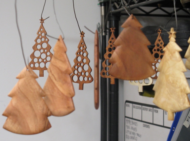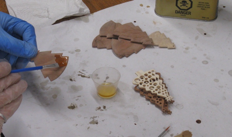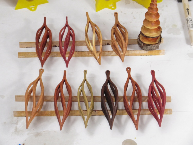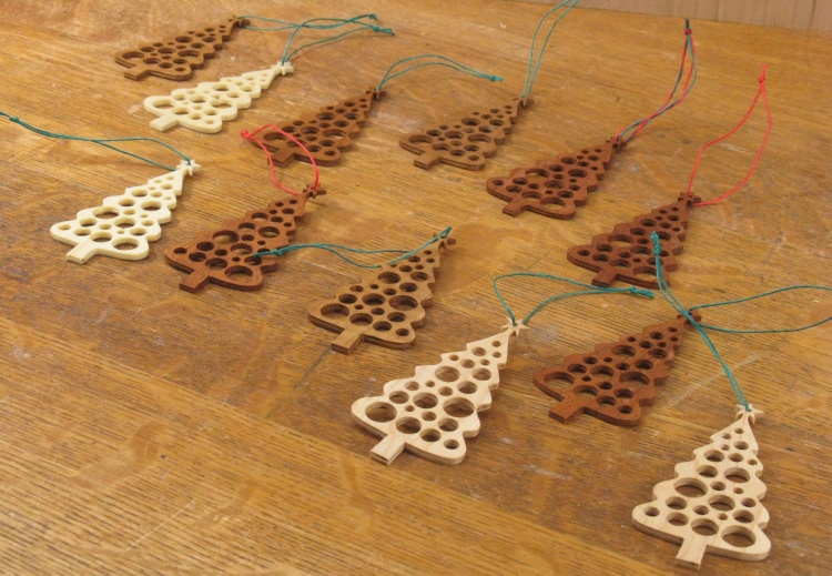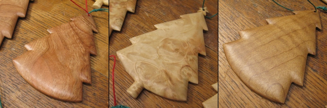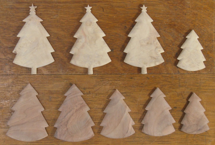 I ended up with the 10 ornaments shown here after their first coat of Deft Danish Oil finish (and an extra little tree that need finishing at the same time).