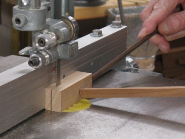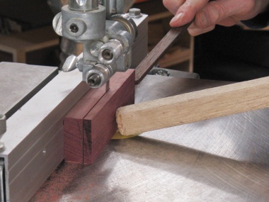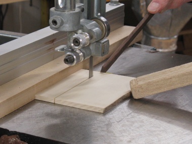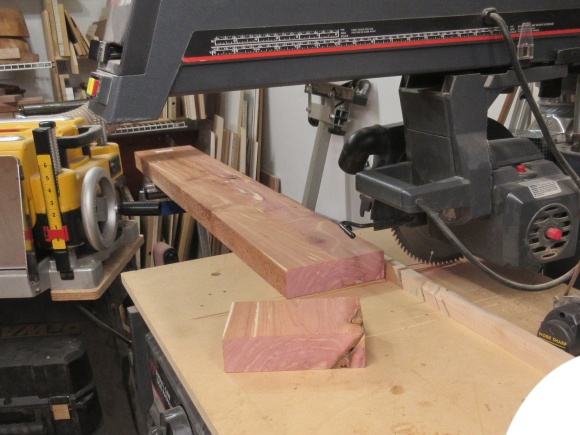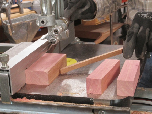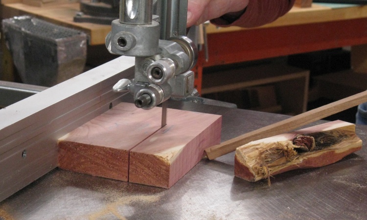 I thought Aromatic Cedar would be a good candidate so here I'm starting to cut up a couple blanks on the band saw.
