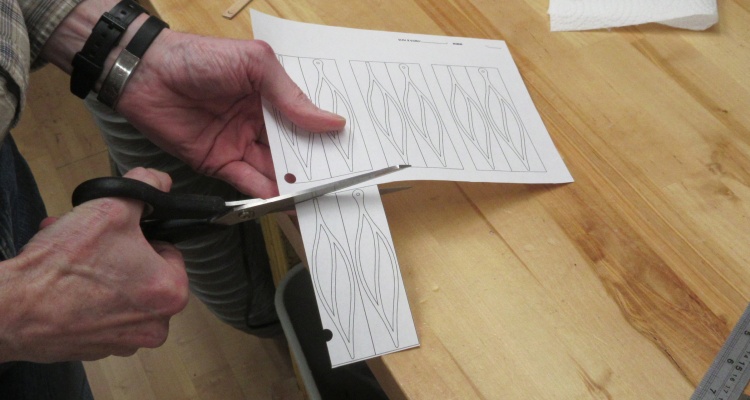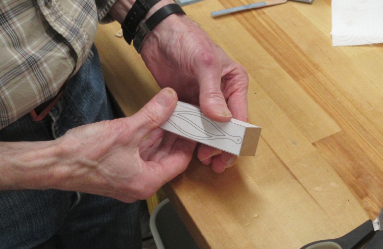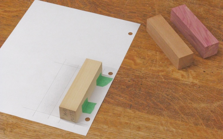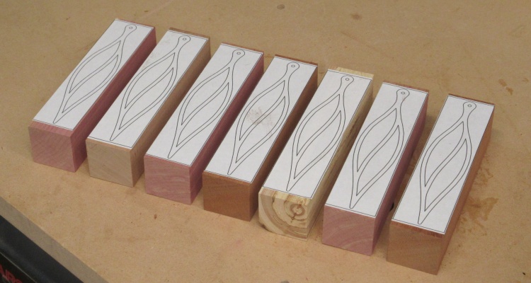 I used my standard trace-it-on-from-a-pattern technique and in this shot I've got a Yellow Cedar blank taped to the bottom of the pattern sheet while the Mahogany and Aromatic Cedar blanks wait their turn.