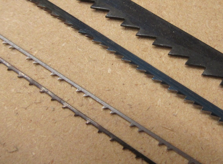 It turns out that part of the problem was blades. The conventional scroll saw blades I had (like the two on the right) were appallingly ineffective. Some research led me to improved models termed PGT for Precision Ground Tooth. There are two varieties of those on the left side of the photo and they are way more effective than conventional blades, particularly for the thick wood I was working on.