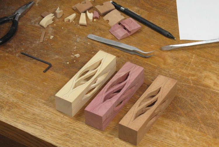 I originally made the blanks from Aspen (being sawn) and Mahogany (in the background) and later made Maple and Roasted Curly Maple versions for a few more trees.