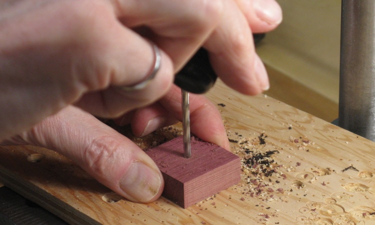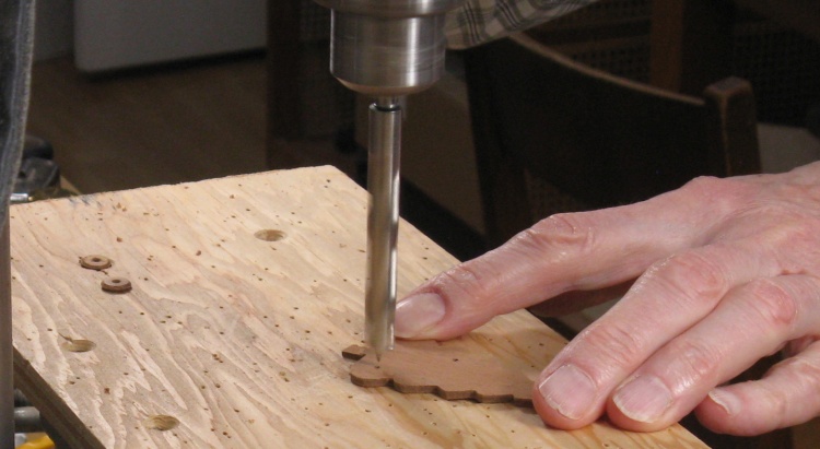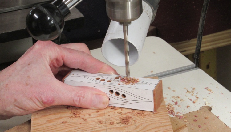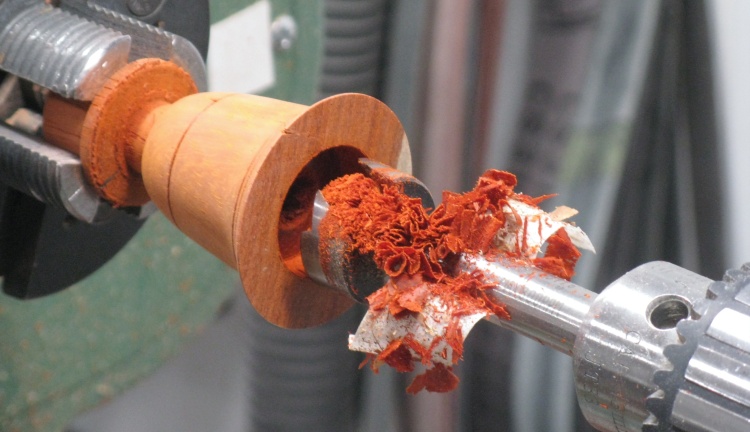 So after getting some decent blades (Olsen PGT 9RG Double-Reverse) I started trying out the hole cutting. Here I'm on the first hole of the Mahogany blank.