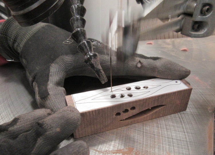 In this shot I'm cutting out a triangle at the end of a hole in a Walnut blank so I can flip the wood around and saw in the opposite direction.