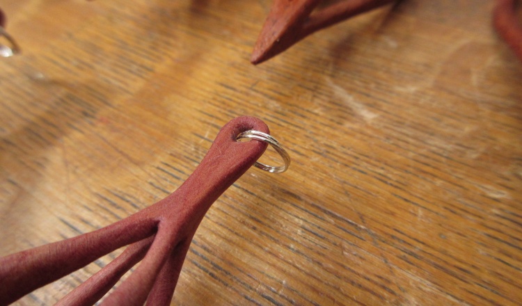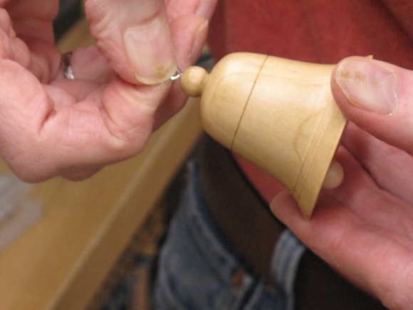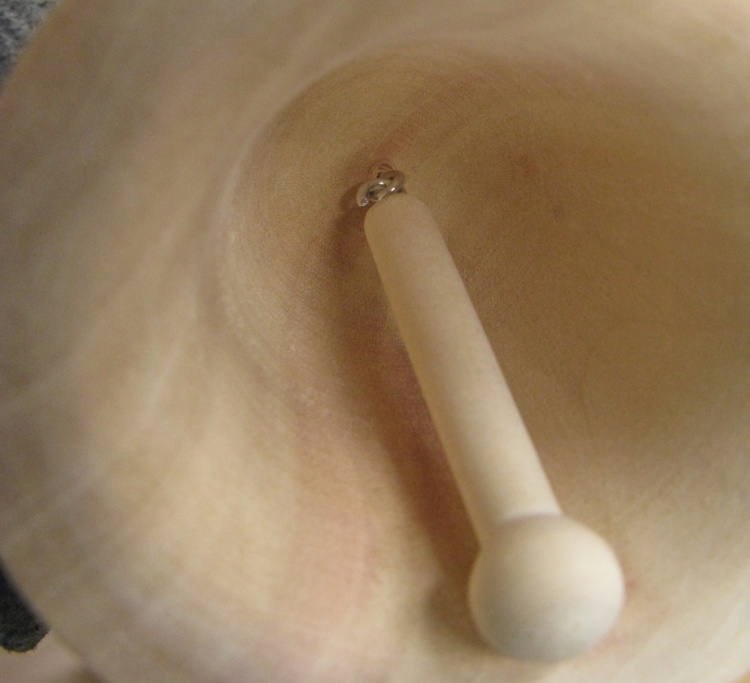 The inside of the bell received a tiny screw eye while the top end of the clapper got a tiny hook (just a screw eye bent slightly open). The hook engaged the eye to support the clapper as can be seen inside this Manitoba Maple bell. That allows the clapper to swing free pealing out a glorious ringing muted clunk.