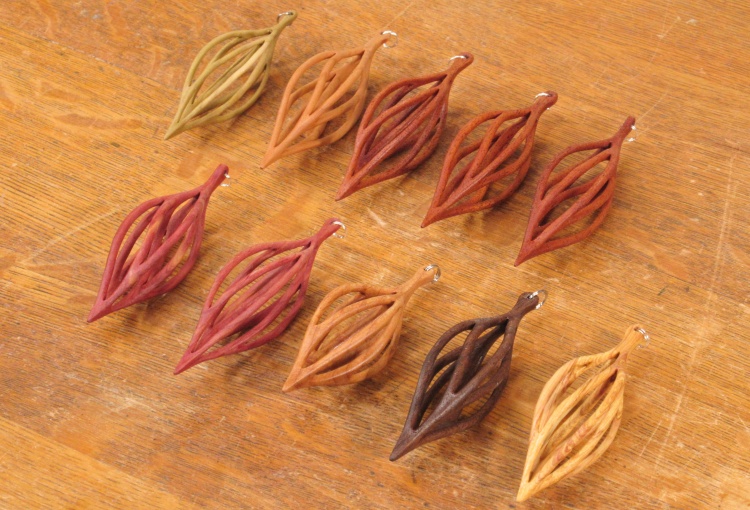 This shot shows all the trees, finished and strung with coloured 0.5 mm hemp cord. They all received two coats of polyurethane varnish.