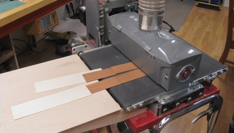 From the band saw, the pieces proceeded to the drum sander which through numerous passes removed saw marks and thinned the wood to a consistent thickness of about 0.035".