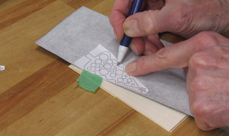 The outline of the tree was traced on using carbon paper and my Official Tracing Pen. The OTP is out of ink so it can trace over a pattern without messing it up. That makes the pattern easier to reuse though I do need to remember which parts of the pattern have already been traced.
