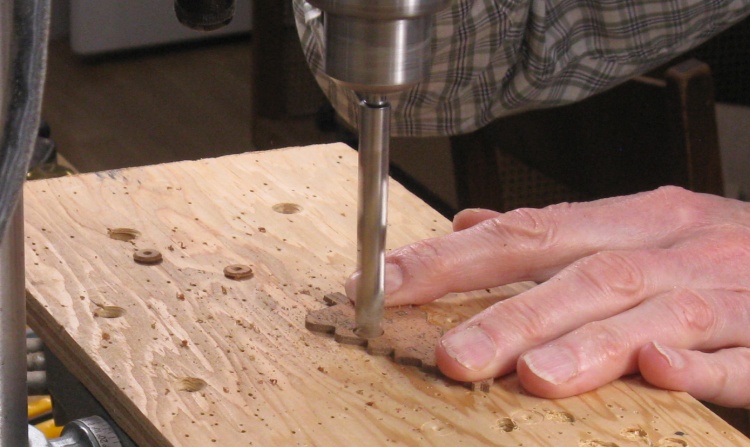 Brad-point bits leave a contoured bottom since the edges and the center go deeper than the rest of the bit bottom. That resulted in a donut-shaped core being cut from each size of hole which I collected here for my own amusement.