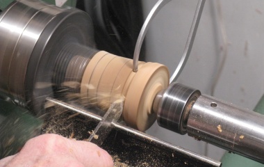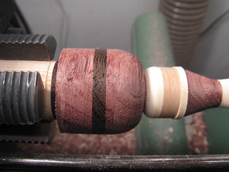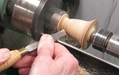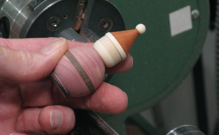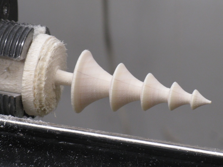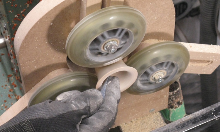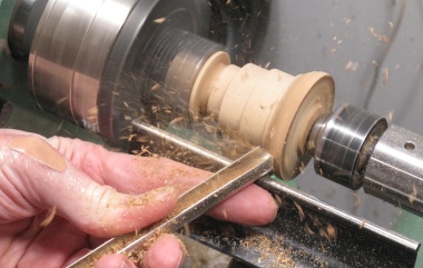 The steady-rest came off, the tailstock with a wooden adapter was moved in and the shaping of the top of the bell was completed.