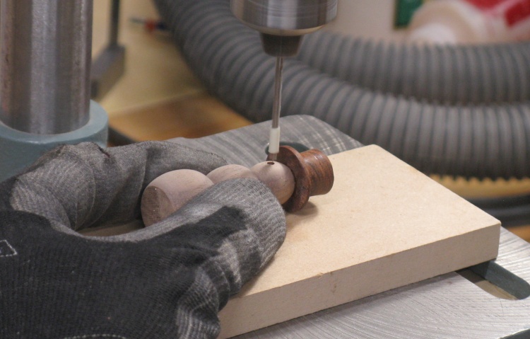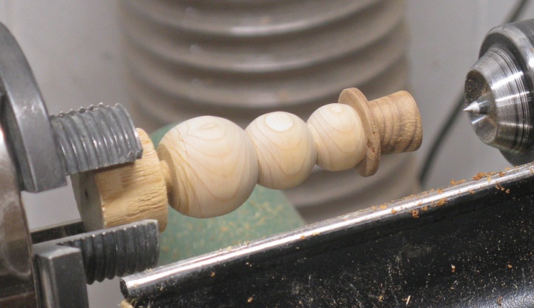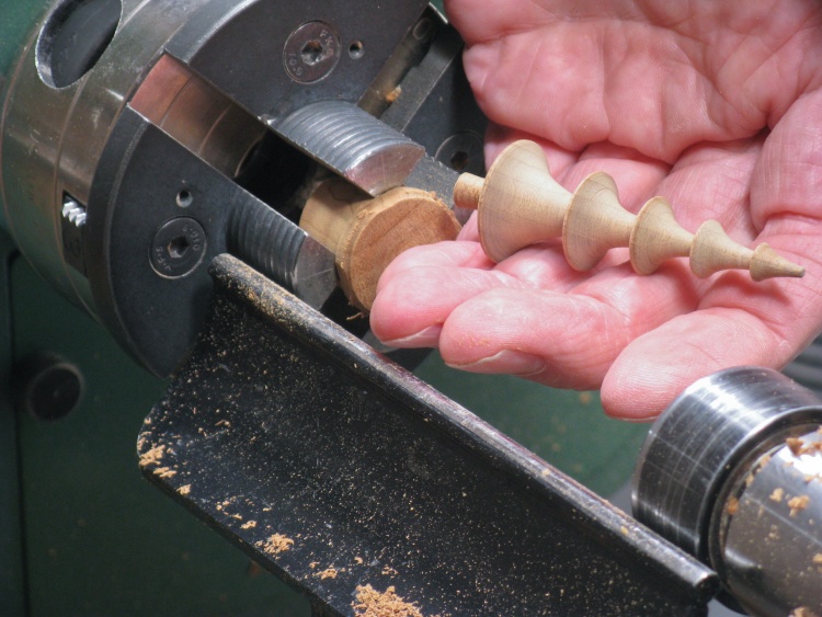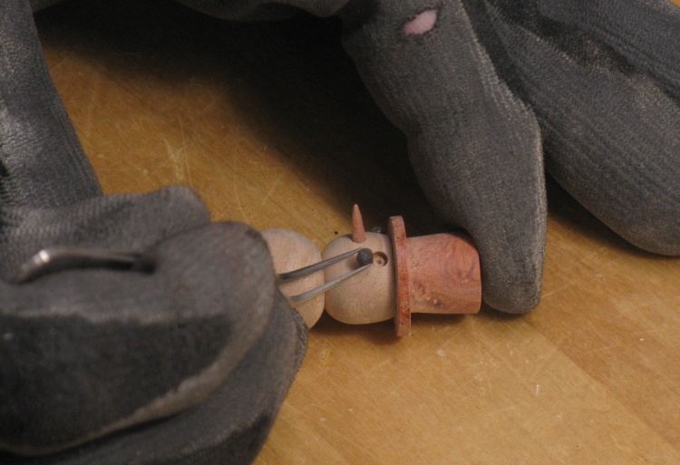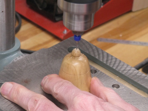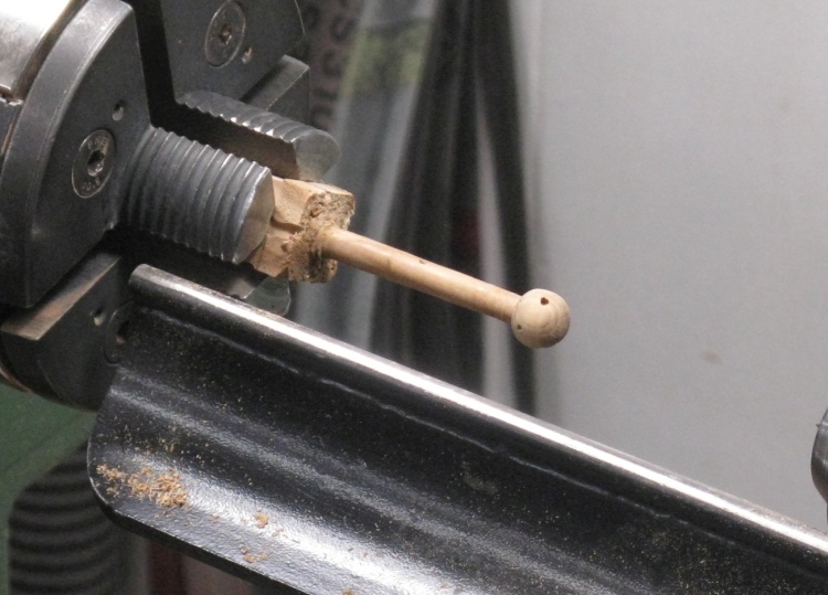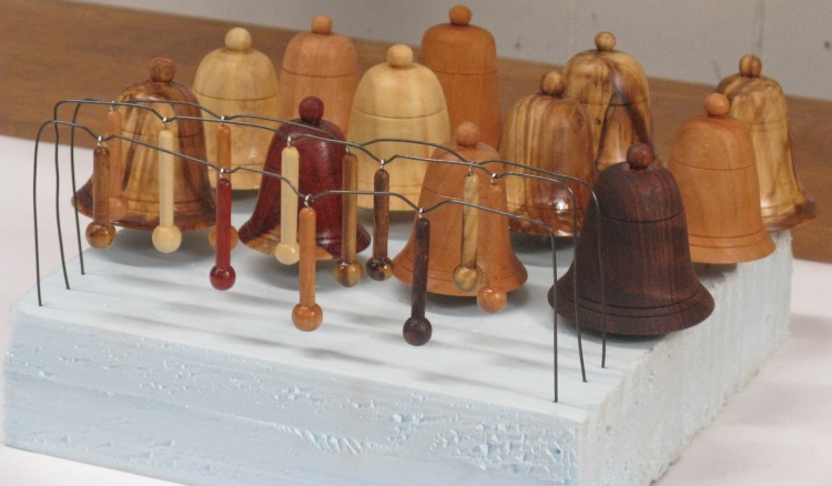 So far all the bells are mute so the next task was to make clappers for them. The clappers are pretty simple ball-on-a-rod shapes, made from the same wood as each bell. Below shows an Ornamental Crab version being turned.
