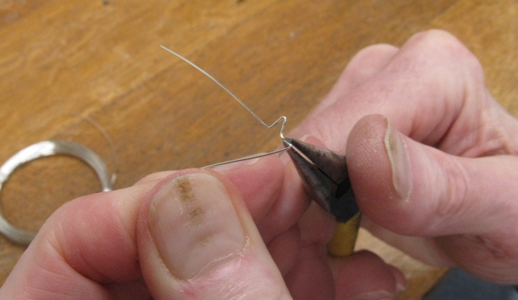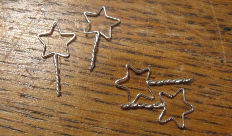 I took a number of tries to find the right wire (a couple of trips to - egads - Michael's) and then figure out how to bend it consistently enough to form a not-painful-to-look-at star shape. A bunch of practise and modifying an old pair of pliers helped with the process and in this shot I'm bending a peak.