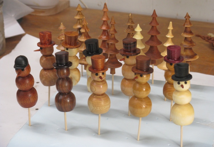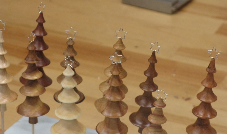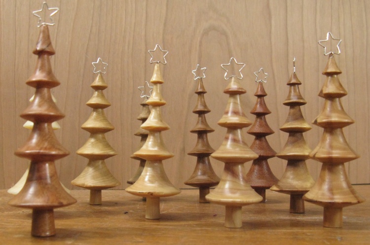 miniature tree decorations I made from tree branches, minus the stand-up base and bark bits. They were turned on the lathe, mostly from small branches but a few from larger pieces of wood. They include a wide variety of (not necessarily known) wood species.