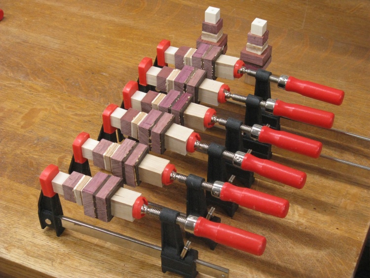 The inner layers were rotated 90° and trimmed to fit into the finished size and then the three layers were epoxied together and clamped between flat surfaces while the glue dried. That resulted in these three blanks, each just big enough for two trees.