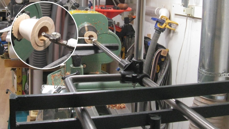 At the time of this photo I hadn't yet set up the three-wheel steady-rest to stabilize the bell during the hollowing but it can be seen in the next photo.