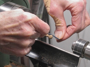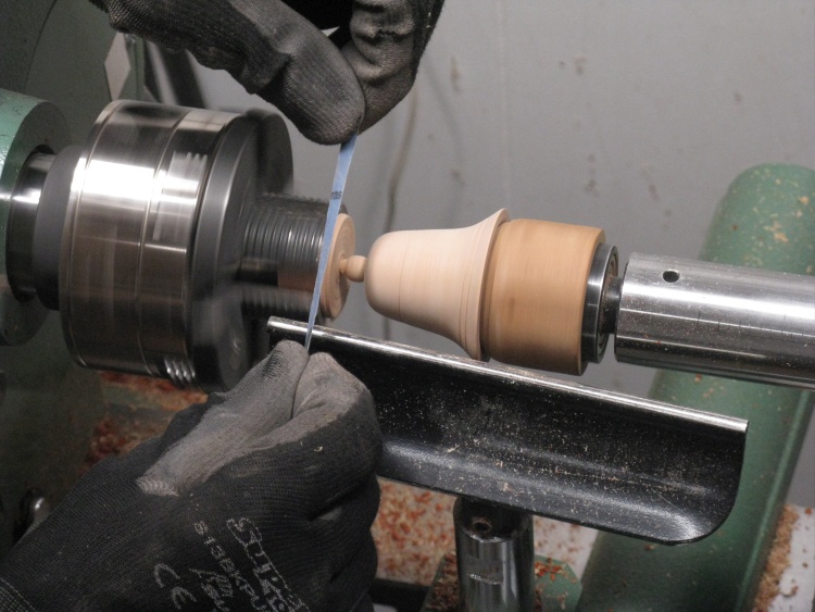 Here I'm getting ready to sand the top before cutting it off the wood in the chuck.