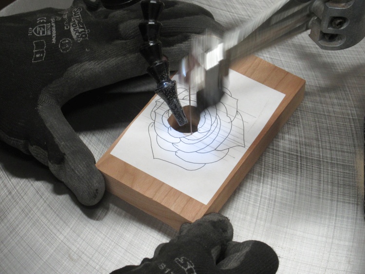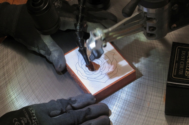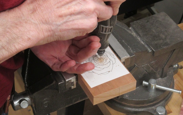 The rose would be cut out starting at the center, so a hole was needed to stick the blade through. The #5 blade I planned to use needed a hole of around 0.05" (yes, it is a small blade) so I drilled one smack dab in the middle of the blossom using the Dremel.