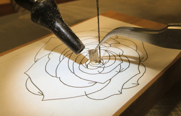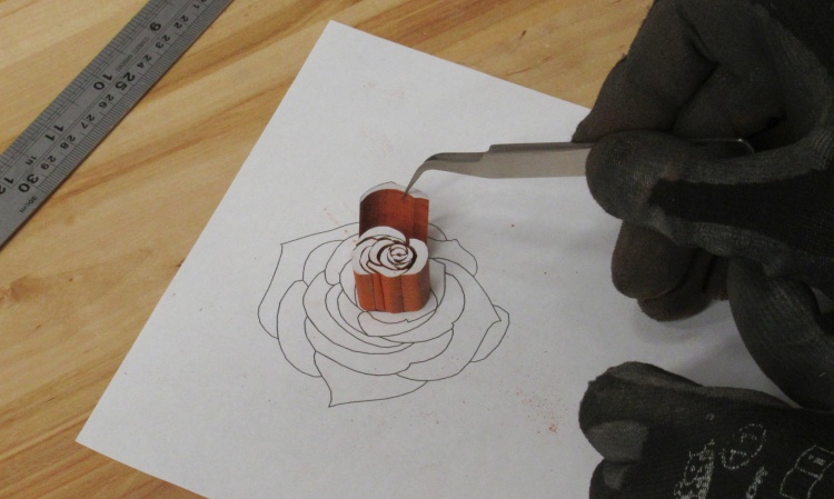 I started on the Padauk rose first. In this shot I've already cut out the first half-dozen or so pieces.