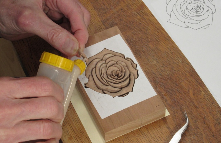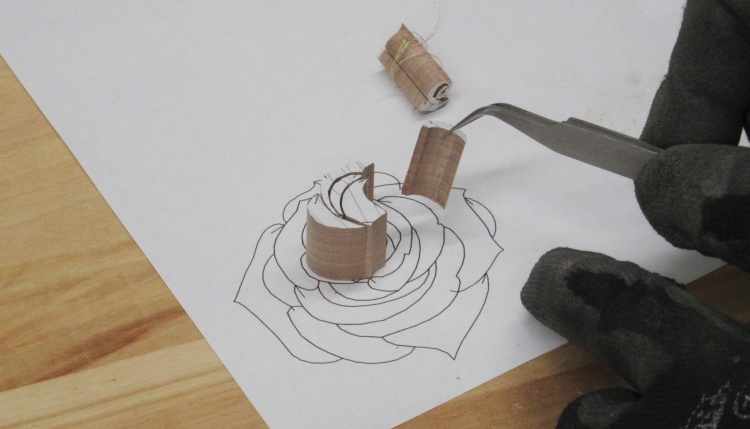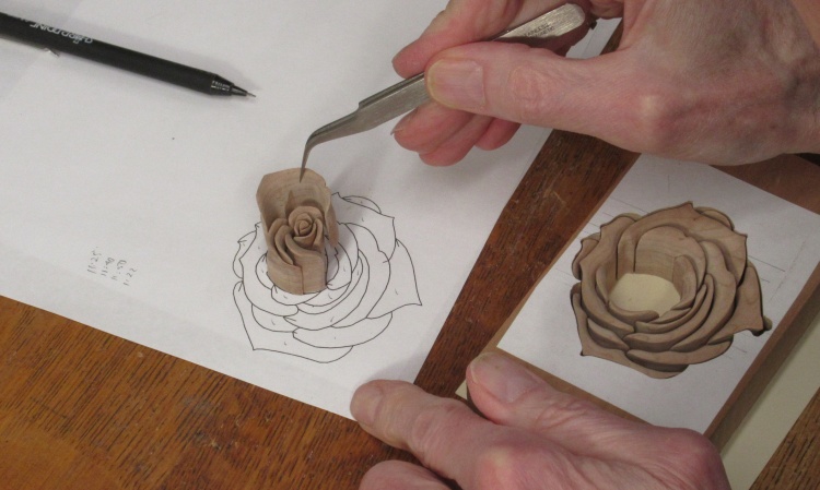 The rose was built up with glued-on petals from the center outward, again done on a pattern to guide placement of the pieces.
