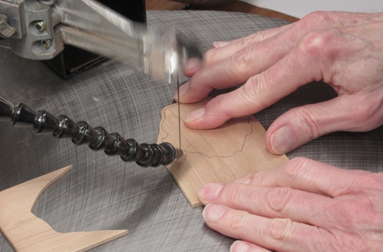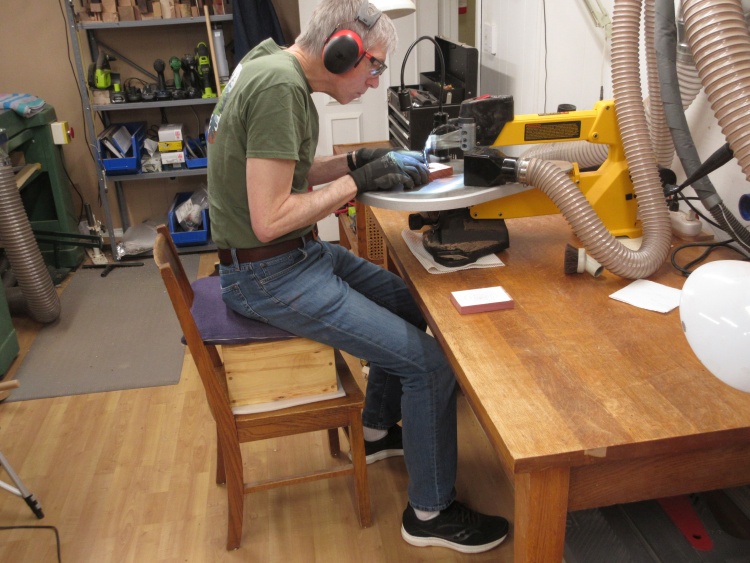 The scroll saw sat on my old oak table but that put the work surface up pretty high. Sitting on my equally old oak chair with my arms up high enough to hold the wood for cutting, my arms started tingling due to blood loss after several minutes of work.