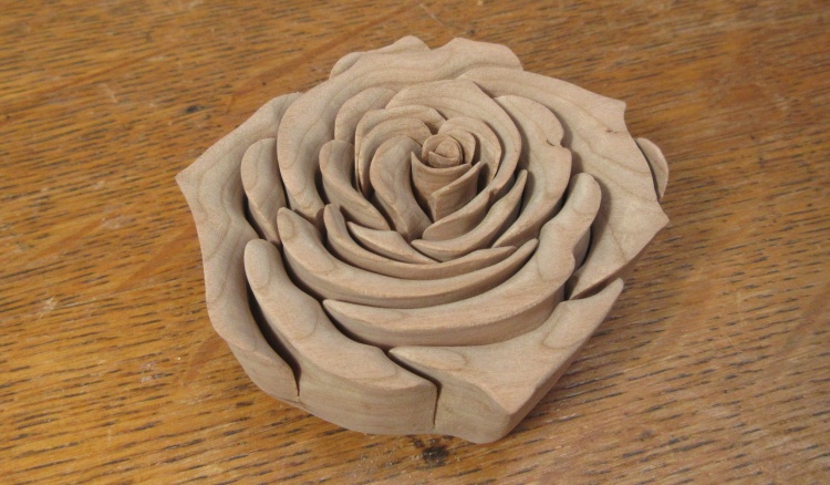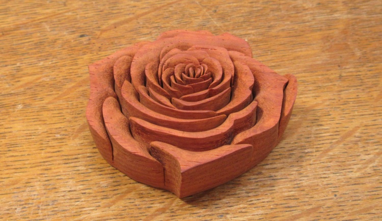 My scroll saw was still sitting out from my last project and I didn't want to have to find a place to stash it since there isn't really room in my workshop. So I thought I'd better just use it for a while longer. I had come across this rose design by virtue of having a video about it pop up as a YouTube suggestion (Acutabove Woodworking). I liked its nice 3-D aspect so it seemed like a fine candidate for storage procrastination. As mentioned on the main page, I didn't really have a specific application for the rose and neither myself nor Sue came up with anything we particularly liked but I thought it would be interesting to make anyway.