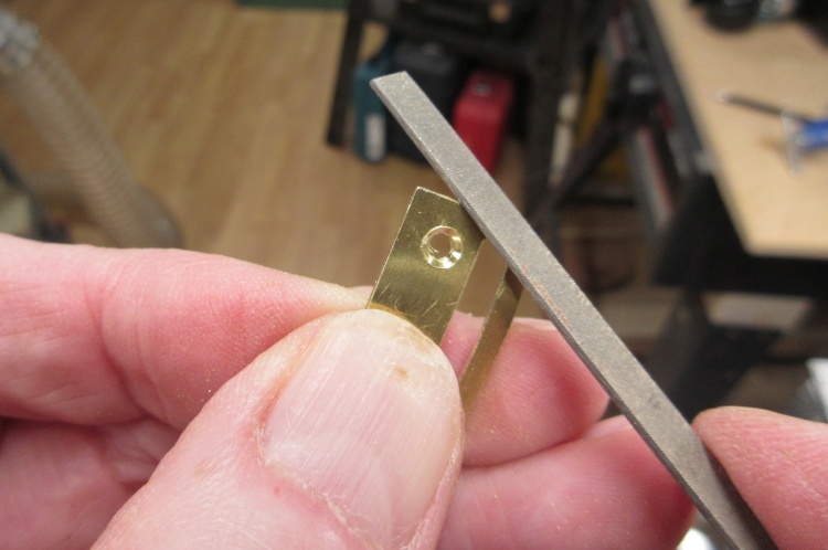 The brass received a slot, a couple of countersunk holes for mounting and a top section bent out to engage a wall hook.