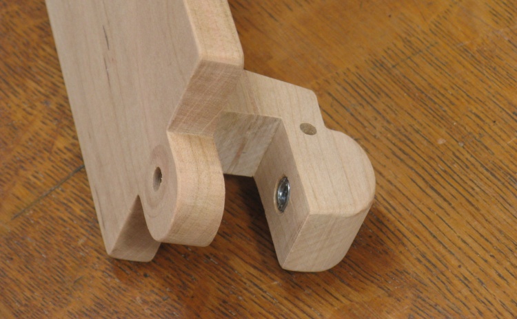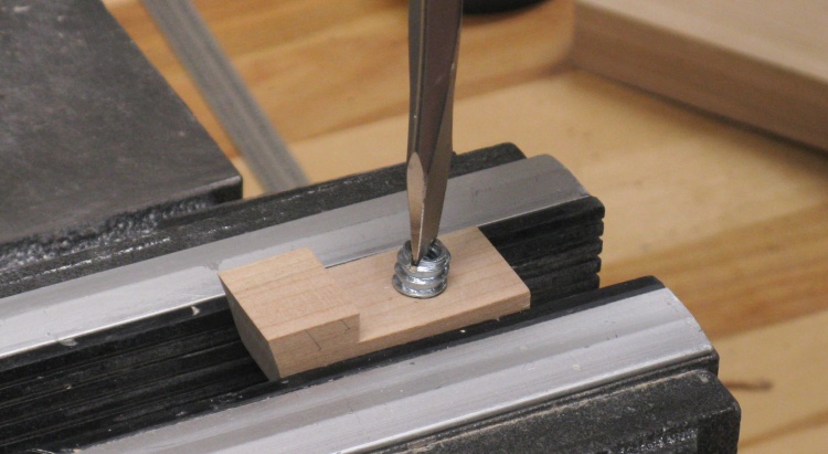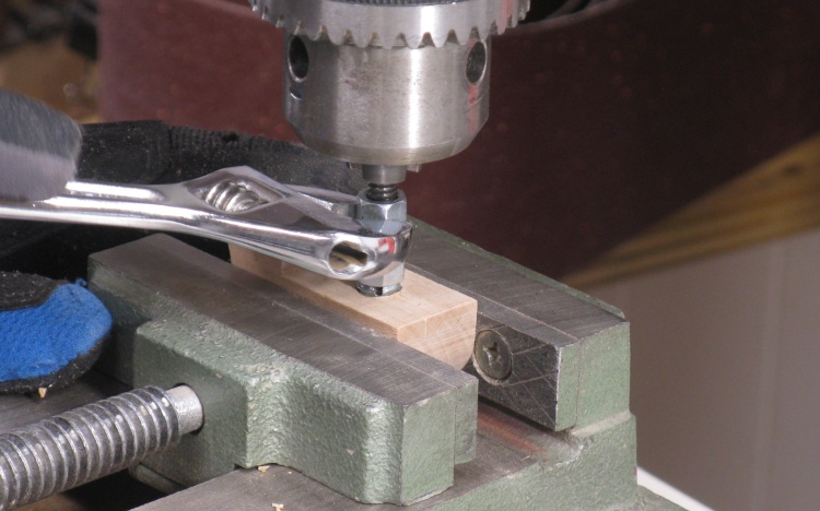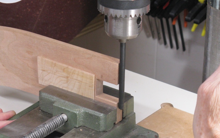 The moveable jaw will hinge on a 3/16"-diameter steel pin. I would need to drill for the pin but there isn't much leeway going through 3" of 1/2"-thick wood. So I spent a while making sure the wood was exactly in line with the drill bit - that thin wedge helps in one dimension.