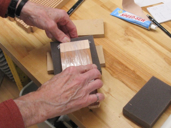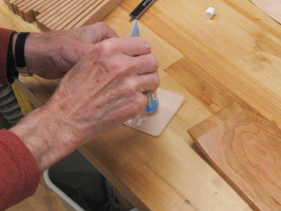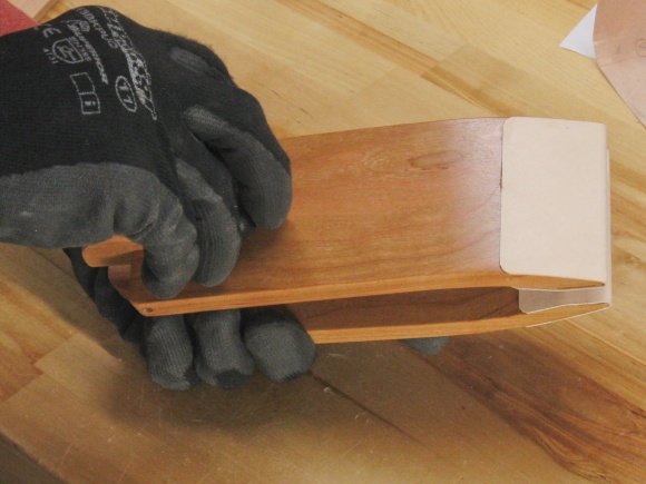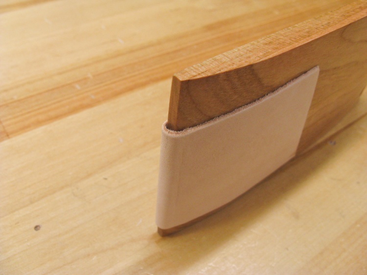 Once the varnishing was done I used one of the test articles to check mounting the leather. I had planned to use a latex adhesive and that seemed to work fine but the wrap around the end was looser than I wanted (despite using a custom-cut end clamp).