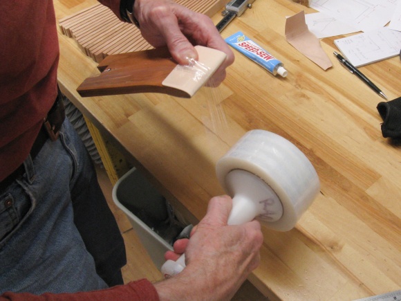 These shots show the liner going into place. To apply pressure on the end where I want a nice 90° corner, I used a stretchy plastic wrap. Then to hold the leather against the non-flat faces of the jaw, some dense foam was added to each side before clamping.