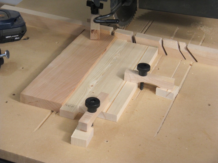 This shot shows the complete setup. The spacer to the right of the Cherry piece is set in place while the Cherry is snuggled up to it and the clamps are tightened, then the spacer is removed before the cut is made. This allows the cut piece to fall away from the blade on the return stroke to prevent marring.
