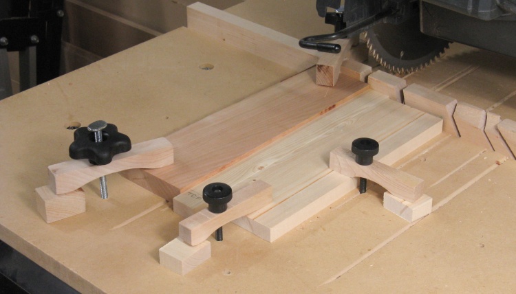Like the one on the right side of the photo, these are simple hold-downs consisting of a screw threaded into the saw table along with a wooden toggle that gets tightened down with a threaded knob.