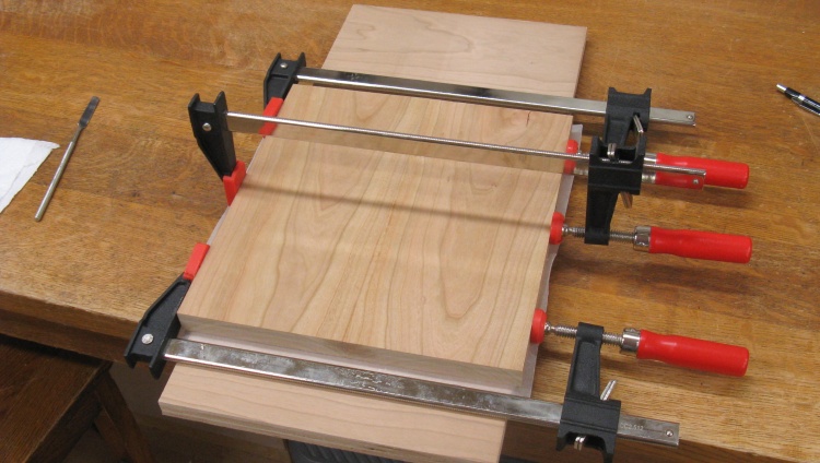 Both of those are shown in this photo; they have been glued on to the 5-ply bottom piece and a barely-in-the-shot clamp is holding things together until the glue sets.