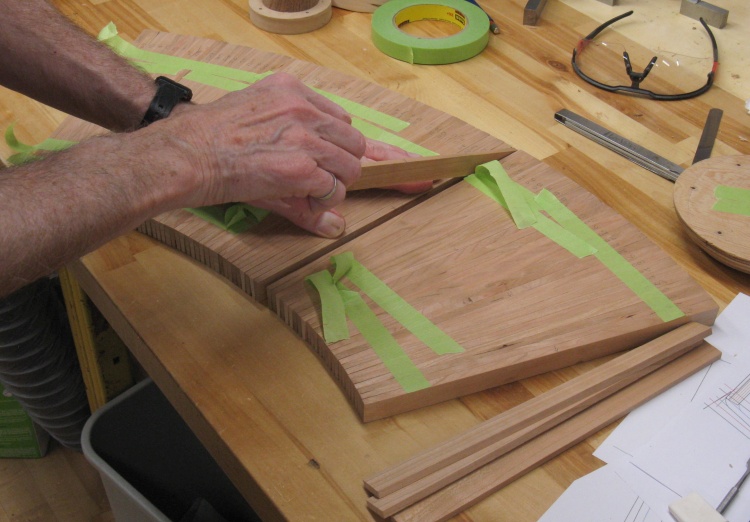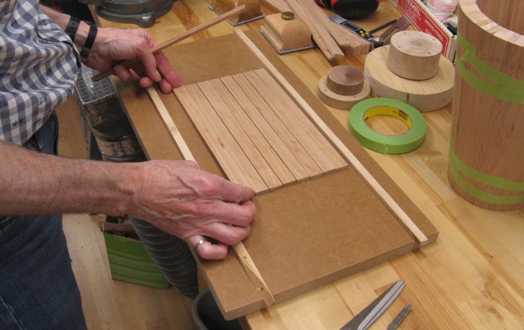 To avoid handling too many thin pieces as the cuts narrowed the boards, I glued some 11"-long sections together side-to-side so I could work with fewer but wider boards. Fortunately I had enough wood that I didn't need to use any of the staves that had the glued joint in them.