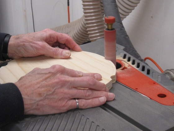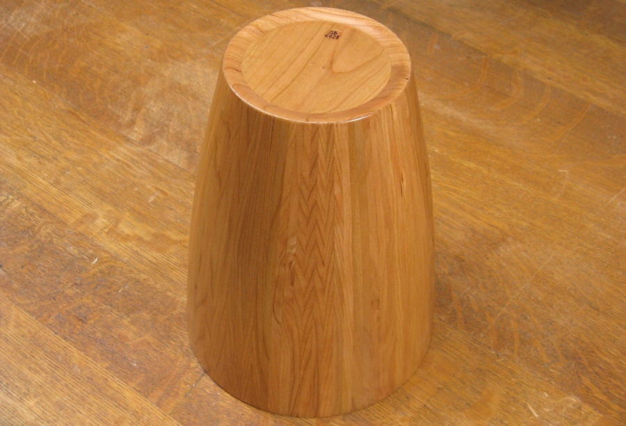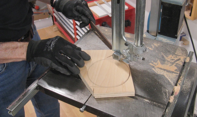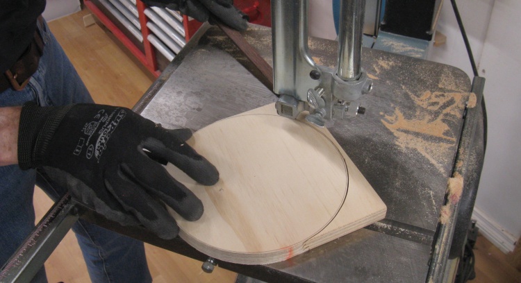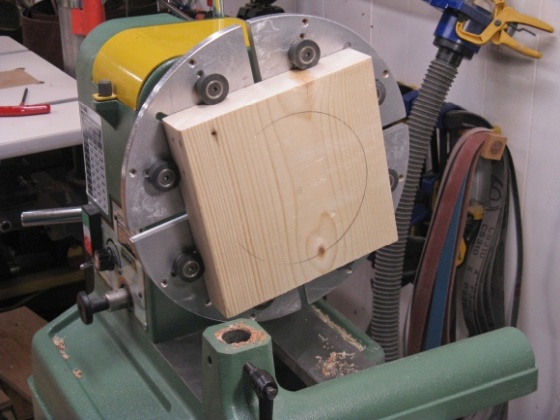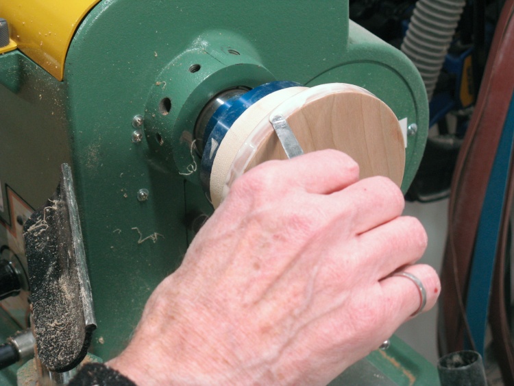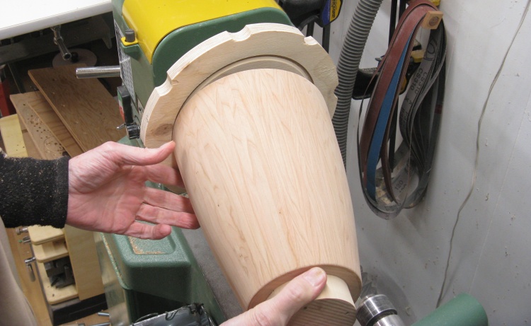 The temporary floor started out as a plywood disc. After cutting, it was rounded and the edges tapered on the belt and disc sanders to nicely wedge into the interior.