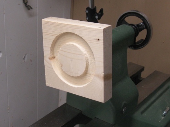 The base would be held at the tailstock end so I needed a smaller-diameter ring that could press-fit over the live center. I just used a piece of construction 4x6 with a hole for the live center in one face and the circular slot for the staves in the other.