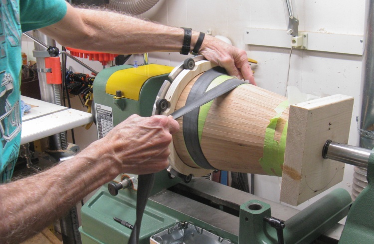 The glued and re-taped body went onto the lathe between the chucks and I stretched a rubber strap (half of an old bike tire inner tube) around to apply radial pressure to the glued joints.
