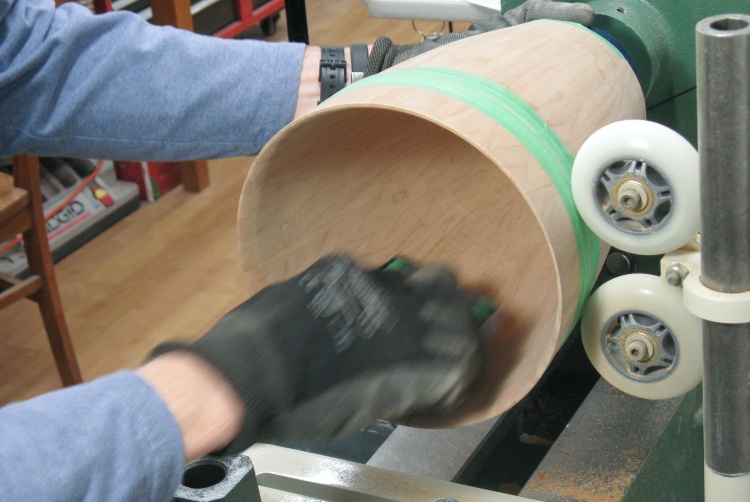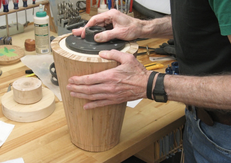 The glued body wasn't quite round so I used the sander to modify the cover to roughly match the interior for better wood-to-wood contact. In this shot I'm checking the fit before doing more sanding.