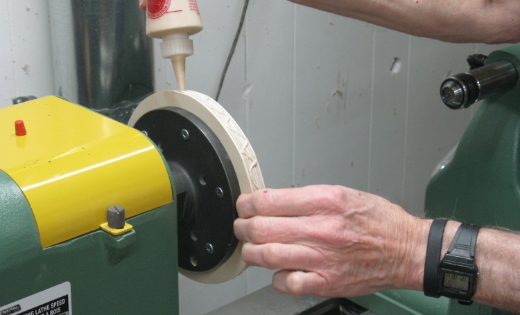 I needed the cover to go into the body at just the right angle so the gluing was done on the lathe. I started by applying a generous amount of glue to the cover edge.