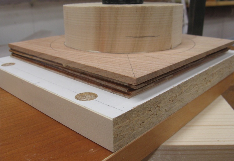 4. Glue a disc to the foot layer to hold a faceplate for turning. It will all be removed with most of the foot layer at the end.