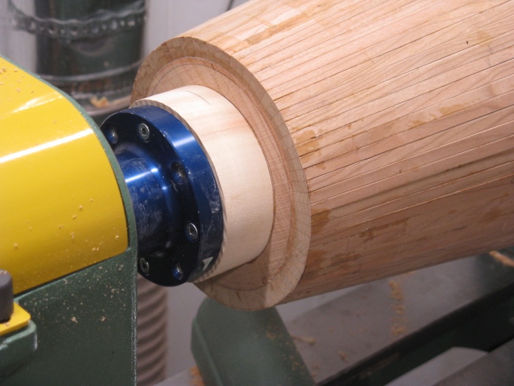 I needed some way to ensure the staves were radially symmetric while drying so the whole thing didn't acquire a lean to one side. The best way I could see to do that was to clamp them into the lathe using top and bottom "chucks" that were properly aligned.