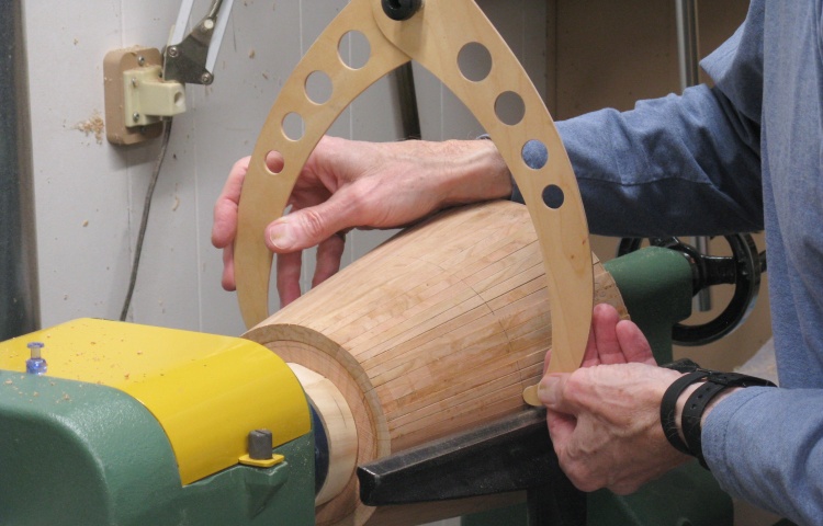 The wastebasket body then was moved to the lathe and attached using the large faceplate on the glued-in cover. The first step was to shorten the bottom end of the staves by half an inch or so to hit the target 10" height.