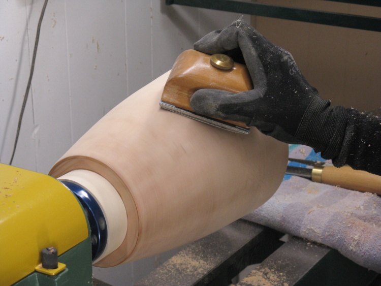 Upon drying of the wood glue, a faceplate was added and the base was cut roundish on the band saw and then made perfectly round through the good offices of this large scraper in combination with the magic of circular symmetry.