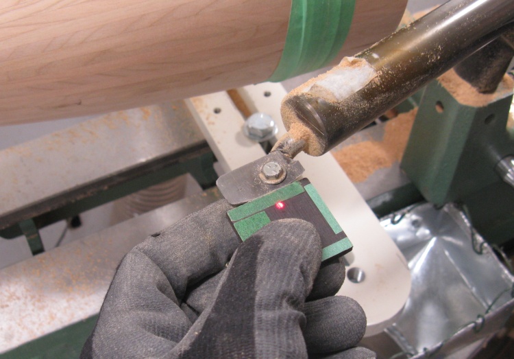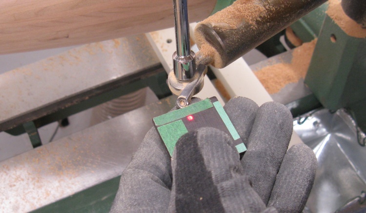 This is a shot of the hollowing setup with the captured hollowing jig and a laser spot showing cutter position.