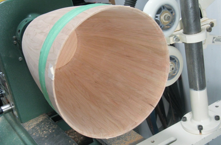 The wastebasket at this point was just an empty tube but it needs a bottom and a bunch of smoothing out and shaping on all surfaces and ends. The plan called for the bottom to be inset so I needed a way to hold the top so the bottom could be accessed. I also wanted to ensure that it was turned radially again so I needed to be careful with the centering at both ends.