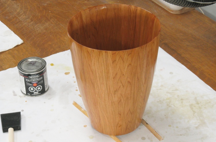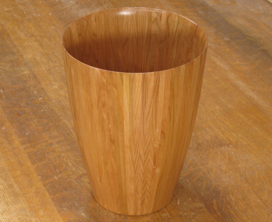 In addition to the shape, I liked what looked like fine vertical laminations. An image search revealed that this was a Bamboo wastebasket so the laminations were sort of part of the manufacturing process, and something that is necessary to make any larger Bamboo woodwork. The Walnut color isn't usually a feature of Bamboo but I hear stains are a thing.